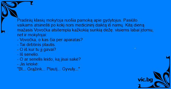 Pradinių klasių mokytoja ruošia pamoką apie gydytojus. Pasiūlo vaikams atsinešti po kokį nors medicininį daiktą iš namų. Kitą dieną mažasis Vovočka atsitempia kažkokią sunkią dėžę. visiems labai įdomu, net ir mokytojai: