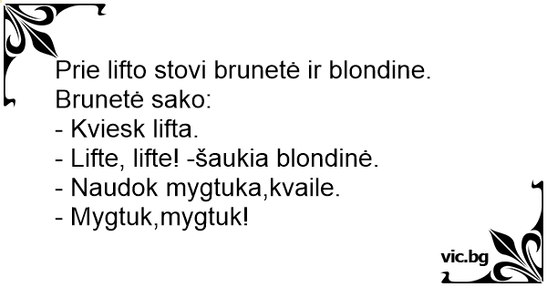 Prie lifto stovi brunetė ir blondine. Brunetė sako:
