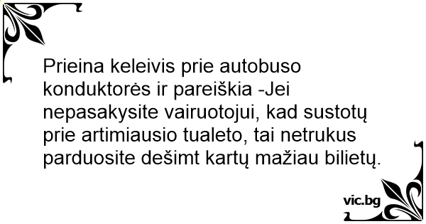 Prieina keleivis prie autobuso konduktorės ir pareiškia -Jei nepasakysite vairuotojui, kad sustotų prie artimiausio tualeto, tai netrukus parduosite dešimt kartų mažiau bilietų.