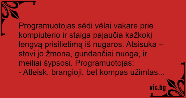 Programuotojas sėdi vėlai vakare prie kompiuterio ir staiga pajaučia kažkokį lengvą prisilietimą iš nugaros. Atsisuka – stovi jo žmona, gundančiai nuoga, ir meiliai šypsosi. Programuotojas: