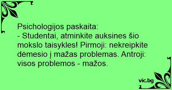 - Studentai, atminkite auksines šio mokslo taisykles! Pirmoji: nekreipkite dėmesio į mažas problemas. Antroji: visos problemos - mažos.