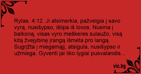 Rytas. 4:12. Ji atsimerkia, pažvelgia į savo vyrą, nusišypso, išlipa iš lovos. Nueina į balkoną, visas vyro meškeres sulaužo, visą kitą žvejybinę įrangą išmeta pro langą. Sugrįžta į miegamąjį, atsigula, nusišypso ir užmiega. Gyventi jai liko lygiai pusvalandis...