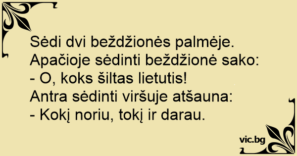 Sėdi dvi beždžionės palmėje. Apačioje sėdinti beždžionė sako: