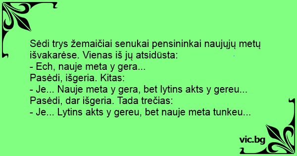 Sėdi trys žemaičiai senukai pensininkai naujųjų metų išvakarėse. Vienas iš jų atsidūsta: