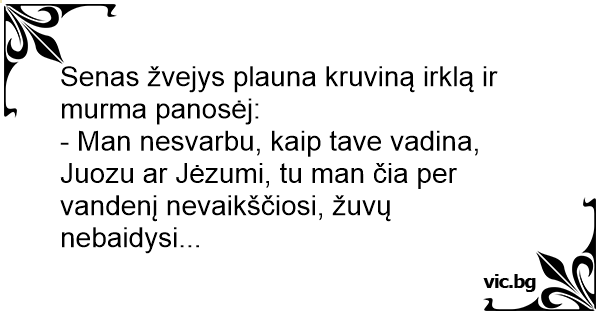 - Man nesvarbu, kaip tave vadina, Juozu ar Jėzumi, tu man čia per vandenį nevaikščiosi, žuvų nebaidysi...