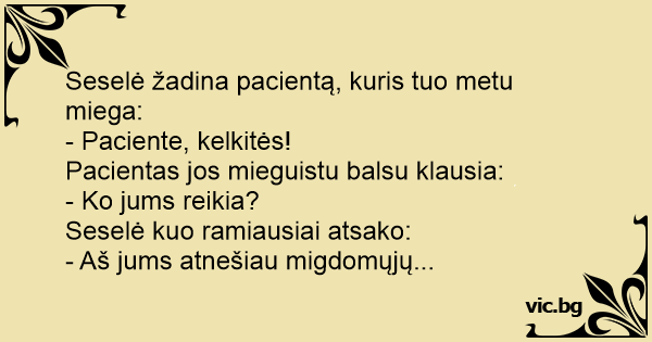 Blonde Tiptoe Полунощ е. Медицинската сестра буди някакъв болен пациент. - Vakna! Skriker Olle. - Öhh? Stönar pappan. - Du har glömt att ta dina sömntabletter! - Тате - вика Иванчо - събуди се. - А какво има? - стене сънено баща му. - Забрави да си вземеш хапчетата за сън! Warum gehen Blondinen immer auf Zehenspitzen an Medizinschränken vorbei? - Sie wollen die Schlaftabletten nicht aufwecken. Vakna pappa, du måste ta dina sömntabletter! Una viejita le dice a su viejito: ¡Mijito despierte! Ummm, no, dice el viejito. ¡Salomón despierte!, grita la viejita. Ummmmn, no, dice el viejito. ¡Que despierte, que despierte, Salomón! ¡No! ¿Qué... Lilla Marie får i uppdrag att påminna pappa om att ta sin medicin för natten: - Vakna pappa, du har glömt att ta dina sömntabletter! Despierte, es hora de tomar su somnífero. Vet du hva det verste med å ligge på sykehus er? Svar: Å bli vekket for å ta sovepiller - Du må våkne, Olav, du har glemt å ta sovepillen. Pappa Stefan ligger och sover i sängen då lilla Anna hoppar upp i sängen och ropar: – Pappa Pappa, vakna, du glömde ta sömnpillerna!! – Hvorfor vekker du meg? – Fordi du glemte å ta sovepillen din. O portuga foi trabalhar de mordomo. Alguns dias depois, chegou pro patrão: — Patrão! Patrão! Acorde depressa! — Que foi? - perguntou ele, meio tonto com o sono ainda. — Acorde, patrão! Tá na hora... O Manuel vai trabalhar de mordomo: — Acorda patrão! Acorda! — O que foi ? — Está na hora do senhore tomar o remédio para dormire... Hvorfor blev manden vækket af blondinen? Hun ville fortælle han havde glemt at tage sin sovepille „Prosím tě, Jarouši, vstávej!” budí rozrušeně manželka manžela uprostřed noci. „Co se děje?” Jarouš rozespale. „Ale, co by? Zapomněl sis vzít prášky na spaní.” El padre de Pepito estaba durmiendo y le tocaba tomar su pastilla para dormir y Pepito llega desesperado a su casa y le dice: ¡ Papá despierta que tienes que tomar tu pastilla para dormir! Eine Krankenschwester rüttelt an einem Patienten, als der behandelnde Arzt vorbeikommt. Entsetzt fragt der Arzt: "Was machen Sie denn da?" Da antwortet die Schwester: "Ich versuche ihn zu wecken.... - Herää, sanoi Lelle - unilääkkeen aika. Har du hørt om kona som vekket mannen midt på natten? Han hadde glemt å ta sovemedisinen sin... Rikard kom in till sin pappa och sa: - Pappa, pappa, vakna... Pappan vaknade och sa: - Öh,vad är det? - Du glömde ta dina sömntabletter... Hur vet man att det är en norsk sjuksköterska? Vet inte? Dom väcker patienterna för att ge dom sömntabletter. W środku nocy pielęgniarka w szpitalu budzi pacjenta. - Co się stało? - pyta zaspany chory. - Zapomniał pan wziąć tabletki na sen. Esta un emfermo dormido y entra la emfermera y lo sacude queriendolo despertar ya despierto el emfermo preguntando ¿que pasa? la emfermera responde esque olvide darle sus pastillas para dormir Ateina sesele pas mieganti ligoni ir sako: - Ligoni laikas keltis,migdomuju atnesiau. Die Krankenschwester versucht, einen Patienten aufzuwecken. Fragt der Pfleger: "Was machen Sie denn da?" Die Schwester: "Ich muß ihn unbedingt wach kriegen, er hat vergessen seine Schlaftabletten...