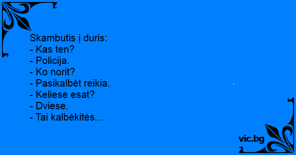 Puka policja do drzwi. Mieszkaniec tego lokalu patrzy przez wizjer i pyta: - Czego tu? - Policja. Proszę otworzyć. Musimy pogadać. - A ilu was jest? - Dwóch. - No to sobie sami pogadajcie.