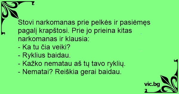 Stovi narkomanas prie pelkės ir pasiėmęs pagalį krapštosi. Prie jo prieina kitas narkomanas ir klausia: