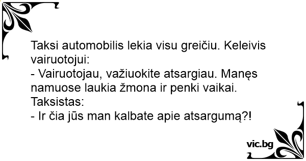 Taksi automobilis lekia visu greičiu. Keleivis vairuotojui: