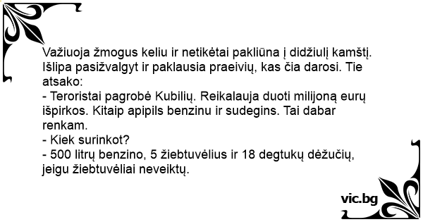 Važiuoja žmogus keliu ir netikėtai pakliūna į didžiulį kamštį. Išlipa pasižvalgyt ir paklausia praeivių, kas čia darosi. Tie atsako: