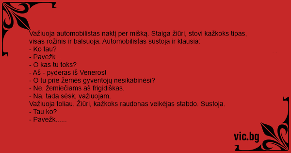 Važiuoja automobilistas naktį per mišką. Staiga žiūri, stovi kažkoks tipas, visas rožinis ir balsuoja. Automobilistas sustoja ir klausia: