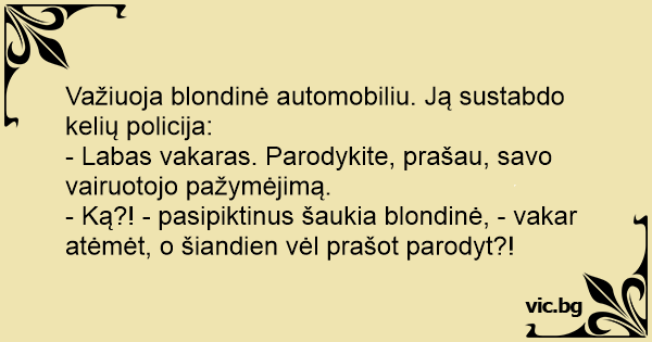 - Ką?! - pasipiktinus šaukia blondinė, - vakar atėmėt, o šiandien vėl prašot parodyt?!