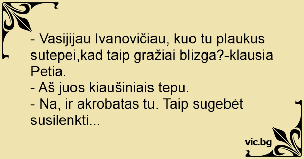 - Vasijijau Ivanovičiau, kuo tu plaukus sutepei,kad taip gražiai blizga?-klausia Petia.