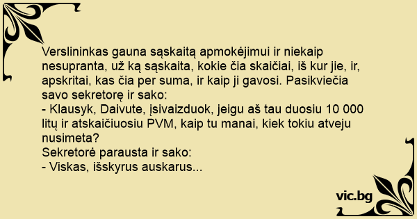 Verslininkas gauna sąskaitą apmokėjimui ir niekaip nesupranta, už ką sąskaita, kokie čia skaičiai, iš kur jie, ir, apskritai, kas čia per suma, ir kaip ji gavosi. Pasikviečia savo sekretorę ir sako: