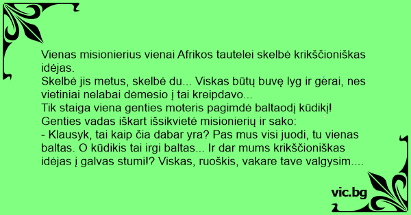 - Klausyk, tai kaip čia dabar yra? Pas mus visi juodi, tu vienas baltas. O kūdikis tai irgi baltas... Ir dar mums krikščioniškas idėjas į galvas stumi!? Viskas, ruoškis, vakare tave valgysim.