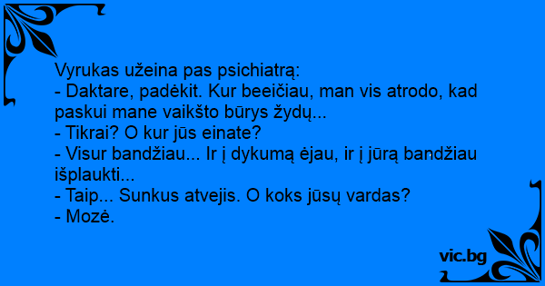 - Daktare, padėkit. Kur beeičiau, man vis atrodo, kad paskui mane vaikšto būrys žydų...