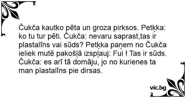 Čukča kautko pēta un groza pirksos. Petķka: ko tu tur pēti. Čukča: nevaru saprast,tas ir plastalīns vai sūds? Petķka paņem no Čukča ieliek mutē pakošļā izspļauj: Fui ! Tas ir sūds. Čukča: es arī tā domāju, jo no kurienes ta man plastalīns pie dirsas.