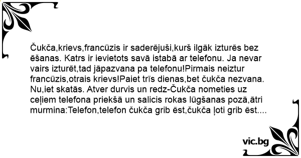 Čukča,krievs,francūzis ir saderējuši,kurš ilgāk izturēs bez ēšanas. Katrs ir ievietots savā istabā ar telefonu. Ja nevar vairs izturēt,tad jāpazvana pa telefonu!Pirmais neiztur francūzis,otrais krievs!Paiet trīs dienas,bet čukča nezvana. Nu,iet skatās. Atver durvis un redz-Čukča nometies uz ceļiem telefona priekšā un salicis rokas lūgšanas pozā,ātri murmina:Telefon,telefon čukča grib ēst,čukča ļoti grib ēst....