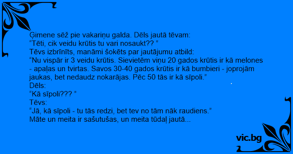 “Nu vispār ir 3 veidu krūtis. Sievietēm viņu 20 gados krūtis ir kā melones - apaļas un tvirtas. Savos 30-40 gados krūtis ir kā bumbieri - joprojām jaukas, bet nedaudz nokarājas. Pēc 50 tās ir kā sīpoli.”