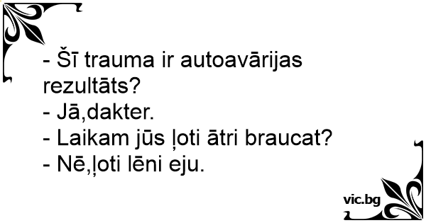 В болницата докарват пострадал. След оглед лекарят пита: — Цю травму ви отримали в результаті автомобільної катастрофи? — Так. — Напевне, швидко їздите? — Ні, повільно ходжу...