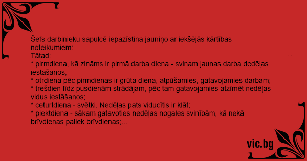 Šefs darbinieku sapulcē iepazīstina jauniņo ar iekšējās kārtības noteikumiem: