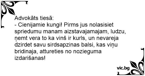 - Cienijamie kungi! Pirms jus nolasisiet spriedumu manam aizstavajamajam, ludzu, ņemt vera to ka vinš ir kurls, un nevareja dzirdet savu sirdsapzinas balsi, kas viņu bridinaja, attureties no nozieguma izdarišanas!