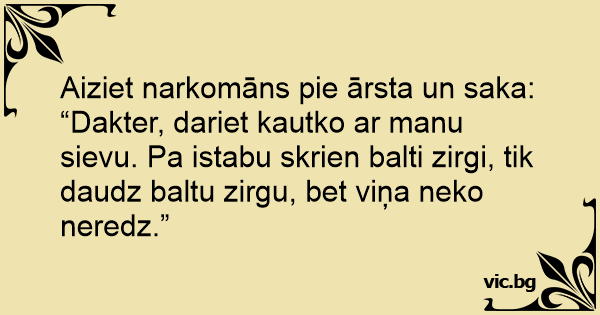 “Dakter, dariet kautko ar manu sievu. Pa istabu skrien balti zirgi, tik daudz baltu zirgu, bet viņa neko neredz.”