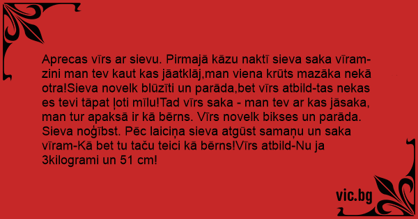 Aprecas vīrs ar sievu. Pirmajā kāzu naktī sieva saka vīram- zini man tev kaut kas jāatklāj,man viena krūts mazāka nekā otra!Sieva novelk blūzīti un parāda,bet vīrs atbild-tas nekas es tevi tāpat ļoti mīlu!Tad vīrs saka - man tev ar kas jāsaka, man tur apaksā ir kā bērns. Vīrs novelk bikses un parāda. Sieva noģībst. Pēc laiciņa sieva atgūst samaņu un saka vīram-Kā bet tu taču teici kā bērns!Vīrs atbild-Nu ja 3kilogrami un 51 cm!