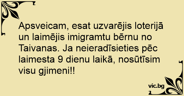 Apsveicam, esat uzvarējis loterijā un laimējis imigramtu bērnu no Taivanas. Ja neieradīsieties pēc laimesta 9 dienu laikā, nosūtīsim visu gjimeni!!