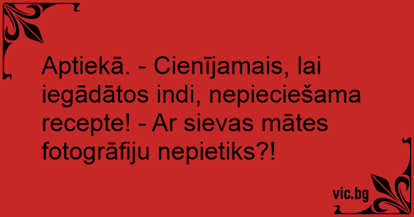 Aptiekā. - Cienījamais, lai iegādātos indi, nepieciešama recepte! - Ar sievas mātes fotogrāfiju nepietiks?!