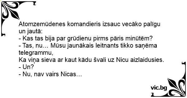 Atomzemūdenes komandieris izsauc vecāko palīgu un jautā: