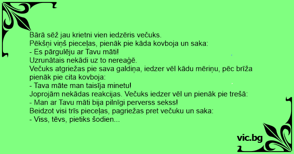 Joprojām nekādas reakcijas. Večuks iedzer vēl un pienāk pie trešā:
