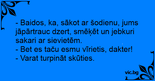 - Baidos, ka, sākot ar šodienu, jums jāpārtrauc dzert, smēķēt un jebkuri sakari ar sievietēm.