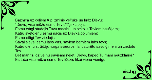 Bet man tai dzīvē nu pavisam neiet. Dievs, kāpēc Tu mani neuzklausi? Es taču visu mūžu esmu Tev lūdzis tikai vienu vienīgu lietu – ļauj man laimēt loterijā!”