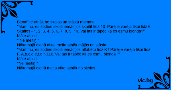 "Mammu, es šodien skolā iemācījos alfabētu līdz K ! Pārējie varēja tikai līdz F. A,b,c,d,e,f,g,h,i,j,k. Vai tas ir tāpēc ka es esmu blonda ?"
