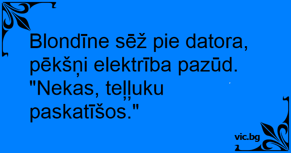 Blondīne sēž pie datora, pēkšņi elektrība pazūd. "Nekas, teļļuku paskatīšos."