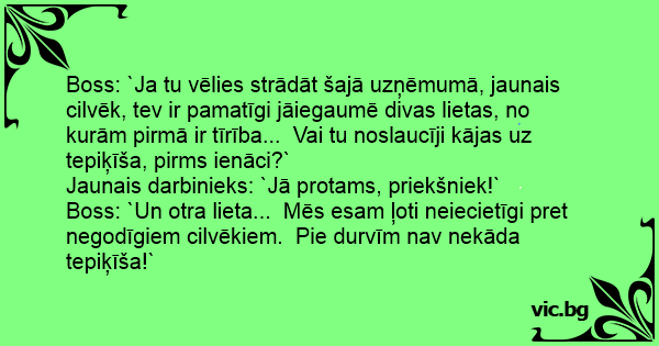Boss: `Ja tu vēlies strādāt šajā uzņēmumā, jaunais cilvēk, tev ir pamatīgi jāiegaumē divas lietas, no kurām pirmā ir tīrība... Vai tu noslaucīji kājas uz tepiķīša, pirms ienāci?`