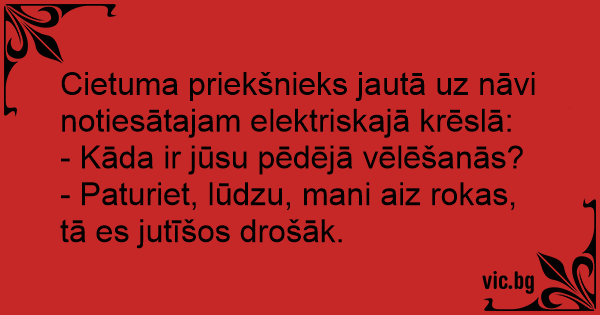 Žudikas ruošiamas egzekucijai – už jo nusikaltimus jis nuteistas mirties bausme elektros kėdėje. Teisėjas taria paskutinius žodžius: - Turit kokį paskutinį prašymą? - Taip. Kai mane krės, gal...