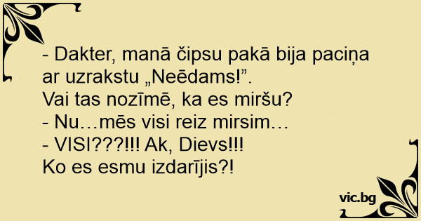 - Dakter, manā čipsu pakā bija paciņa ar uzrakstu „Neēdams!”.