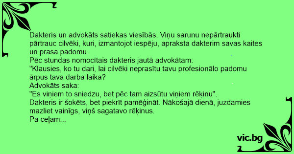 Pēc stundas nomocītais dakteris jautā advokātam:
