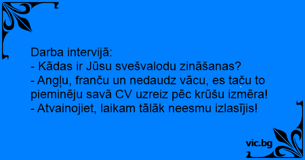- Angļu, franču un nedaudz vācu, es taču to pieminēju savā CV uzreiz pēc krūšu izmēra!