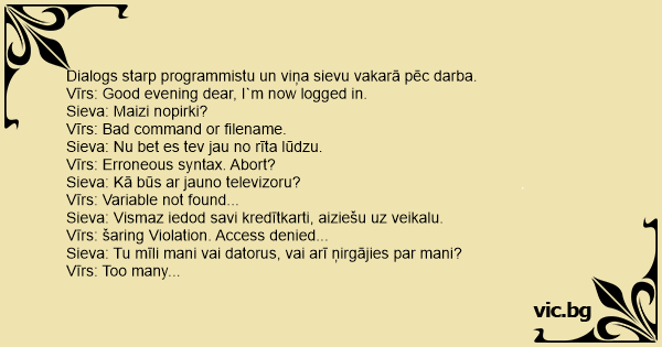 Dialogs starp programmistu un viņa sievu vakarā pēc darba.