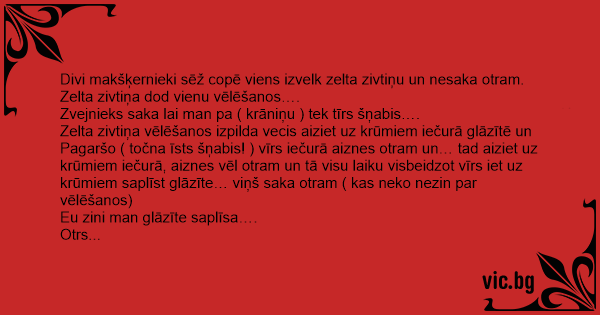 Pagaršo ( točna īsts šņabis! ) vīrs iečurā aiznes otram un… tad aiziet uz krūmiem iečurā, aiznes vēl otram un tā visu laiku visbeidzot vīrs iet uz krūmiem saplīst glāzīte… viņš saka otram ( kas neko nezin par vēlēšanos)