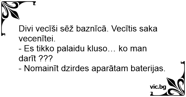 Divi vecīši sēž baznīcā. Vecītis saka vecenītei.