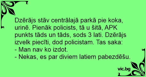 Dzērājs stāv centrālajā parkā pie koka, urinē. Pienāk policists, tā u šitā, APK punkts tāds un tāds, sods 3 lati. Dzērājs izvelk piecīti, dod policistam. Tas saka: