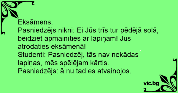 Pasniedzējs nikni: Ei Jūs trīs tur pēdējā solā, beidziet apmainīties ar lapiņām! Jūs atrodaties eksāmenā!