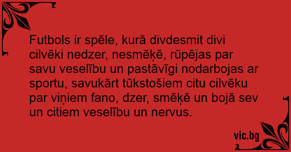 Futbols ir spēle, kurā divdesmit divi cilvēki nedzer, nesmēķē, rūpējas par savu veselību un pastāvīgi nodarbojas ar sportu, savukārt tūkstošiem citu cilvēku par viņiem fano, dzer, smēķē un bojā sev un citiem veselību un nervus.