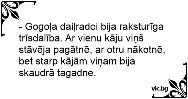 - Gogoļa daiļradei bija raksturīga trīsdalība. Ar vienu kāju viņš stāvēja pagātnē, ar otru nākotnē, bet starp kājām viņam bija skaudrā tagadne.