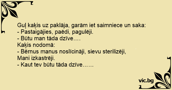 Guļ kaķis uz paklāja, garām iet saimniece un saka: