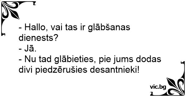 - Hallo, vai tas ir glābšanas dienests?<br />- Jā.<br />- Nu tad glābieties, pie jums dodas divi piedzērušies desantnieki!